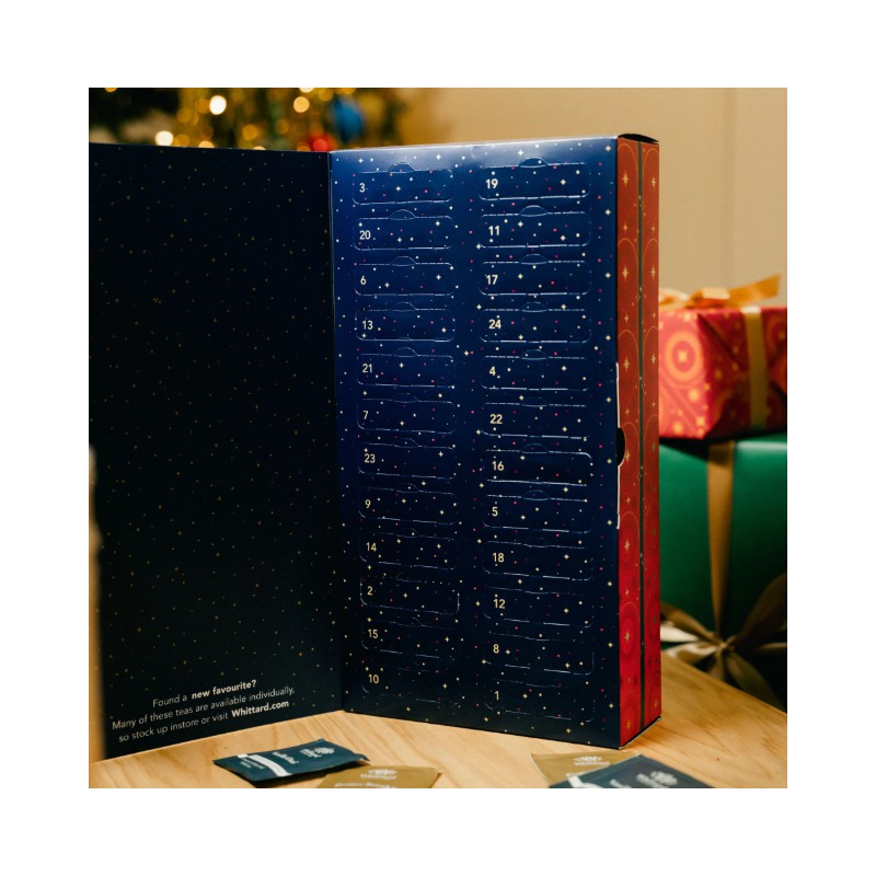 Odkryj radość świąt Bożego Narodzenia dzięki codziennemu wyborowi najlepszych czarnych herbat Whittard. Za każdą szufladą kryje się mała, świąteczna niespodzianka – liczne torebki herbaty pełne starannie dobranych smaków i aromatów, idealne do delektowania się nimi lub dzielenia. Spraw, by każdy poranek był wyjątkowy, gdy rozpakujesz nowy smak.